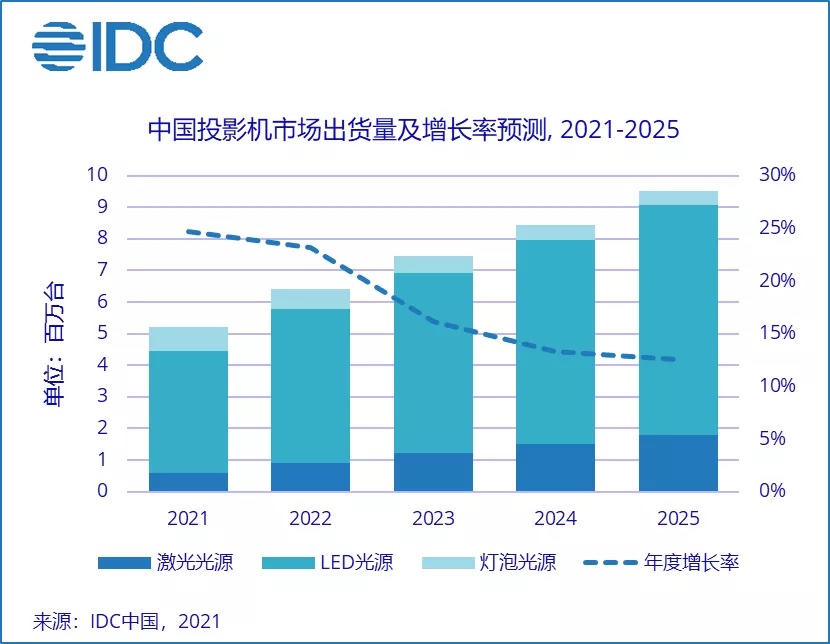 最新发布的《IDC 2021年第二季度我国投影机商场盯梢陈述》显现,2021年上半年我国投影机商场总出货量227万台,同比增加32.4%。相对于2020年同期,因为新冠疫情在国内得到了有用管控,商场需求上升显着。可是芯片端以及物料紧缺导致供小于求,商场体现低于预期。长时间来看,IDC依旧看好这一商场。估计至2025年我国投影机商场五年复合增加率将超越16%。