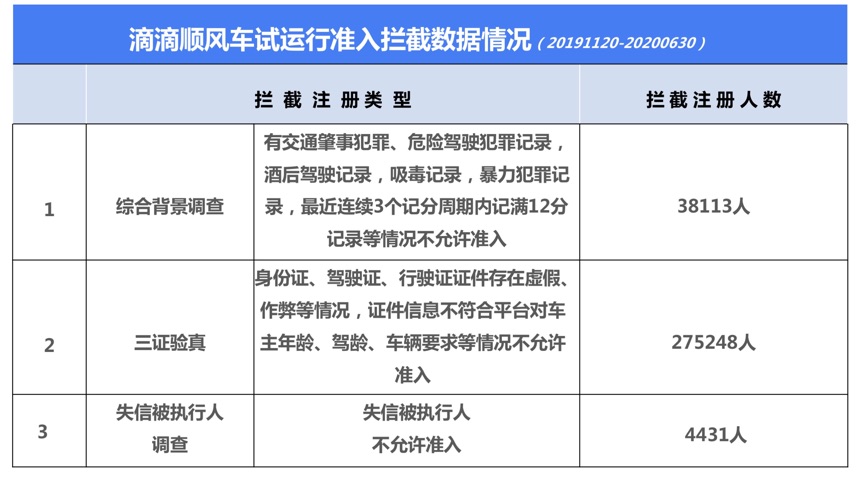 陈述显现,试运转期间,滴滴顺风车进一步进步准入门槛,驳回不符合新认证要求(归纳布景审阅、失期人筛查、三证验真)的车主 317792 人,对 824 名名代刷脸及运用做弊东西的用户永久暂停服务。一起,为提高用户安全危险防备认识,滴滴顺风车在各环节推出安全教育,掩盖了准入、违规、日常出行提示等多个场景,展开教育及语音播报提示合计约 7491 万次。