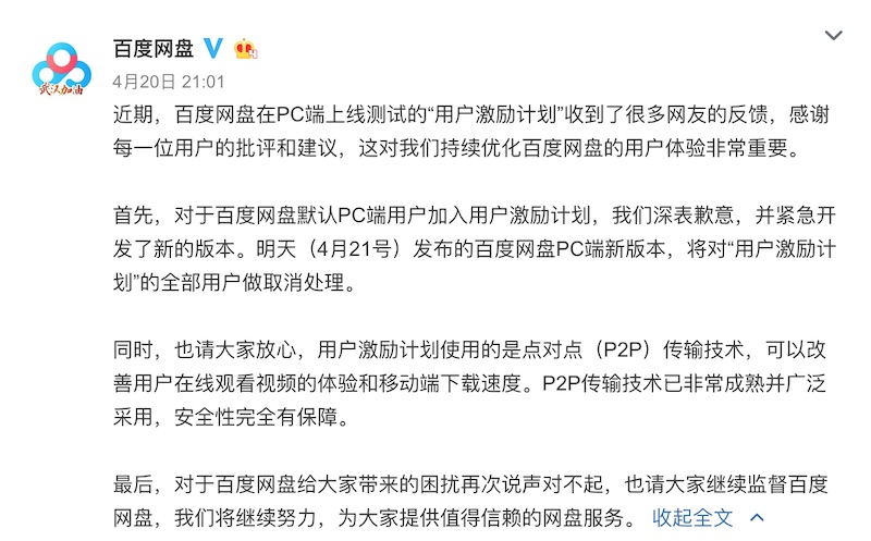 百度网盘方面对此事“深表歉意”,并紧迫开发了新版别,4 月 21 号发布的百度网盘 PC 端新版别,将撤销“用户鼓励方案”。
