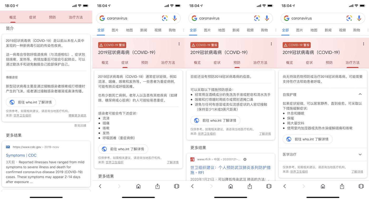 别的,经过桌面或移动端 Google 查找关键词“coronavirus”或“covid-19”,能够看到与上述网站相同的概述、症状、防备等内容。