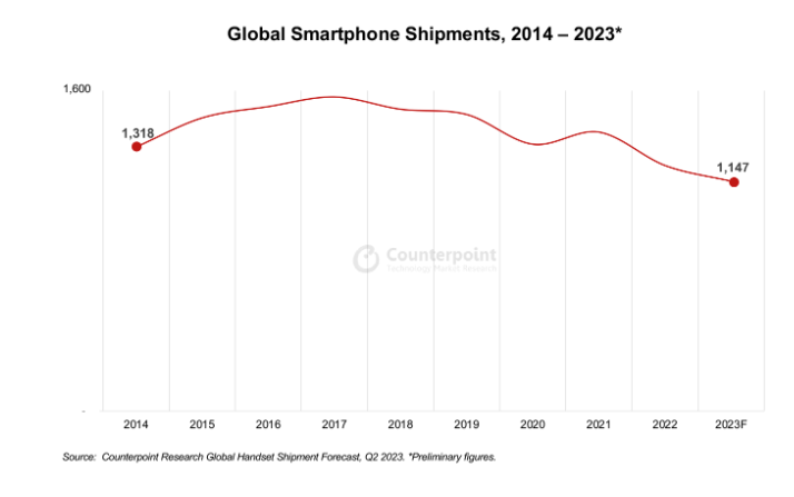 依据Counterpoint发布的最新数据,2023 年全球智能手机出货量下降了6%,仅达11.5亿部,创下十年来的新低。包含我国在内的亚洲区域面对经济窘境,影响了增加,并导致新式商场呈现下滑。